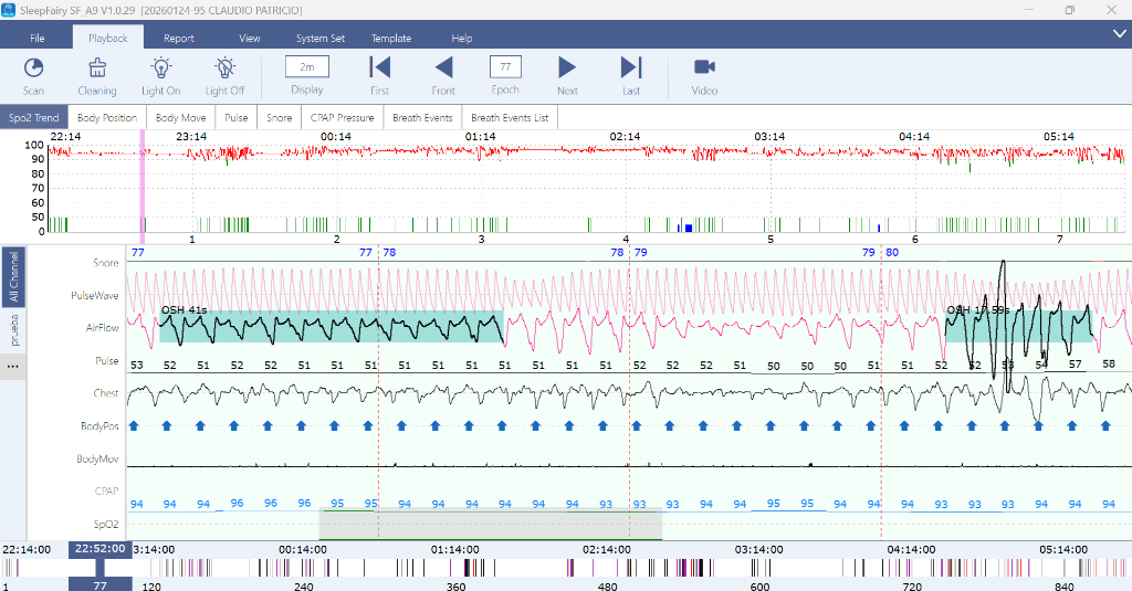 Generación instantánea de informes con índices AHI, ODI y resumen de eventos.